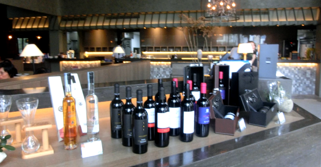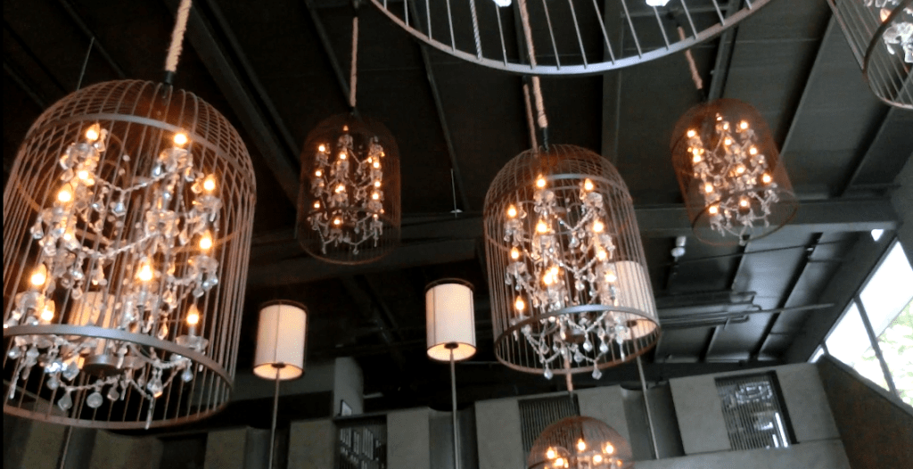 The exterior of the establishment was constructed in a simple, modern style. However, the interior had a much more luxurious atmosphere; there were chandeliers encased in bird cages hanging from the ceiling and each table was covered in a white tablecloth and had its own shaded lamp. There were even tables showcasing the wine selection and offering ingredients used in the dishes for sale.