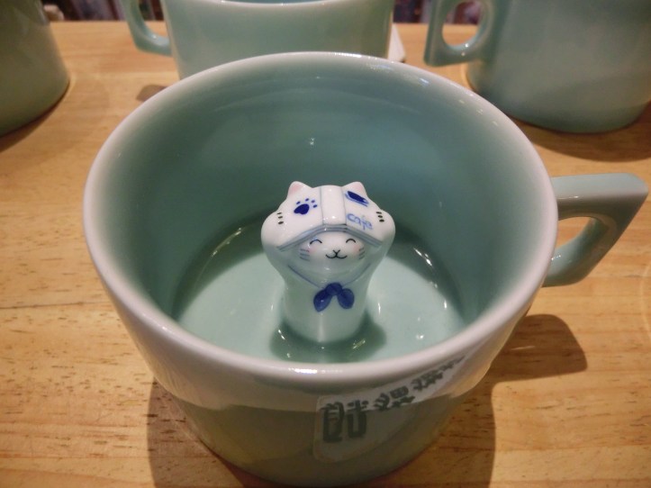 Being a cat lover, I insisted that we enter the Momi Cafe, a small cat-themed shop decorated with rainbow signage and string lights. The Cafe offered gifts like postcards (featuring cats, of course), and mugs with ceramic animals standing in the middle!