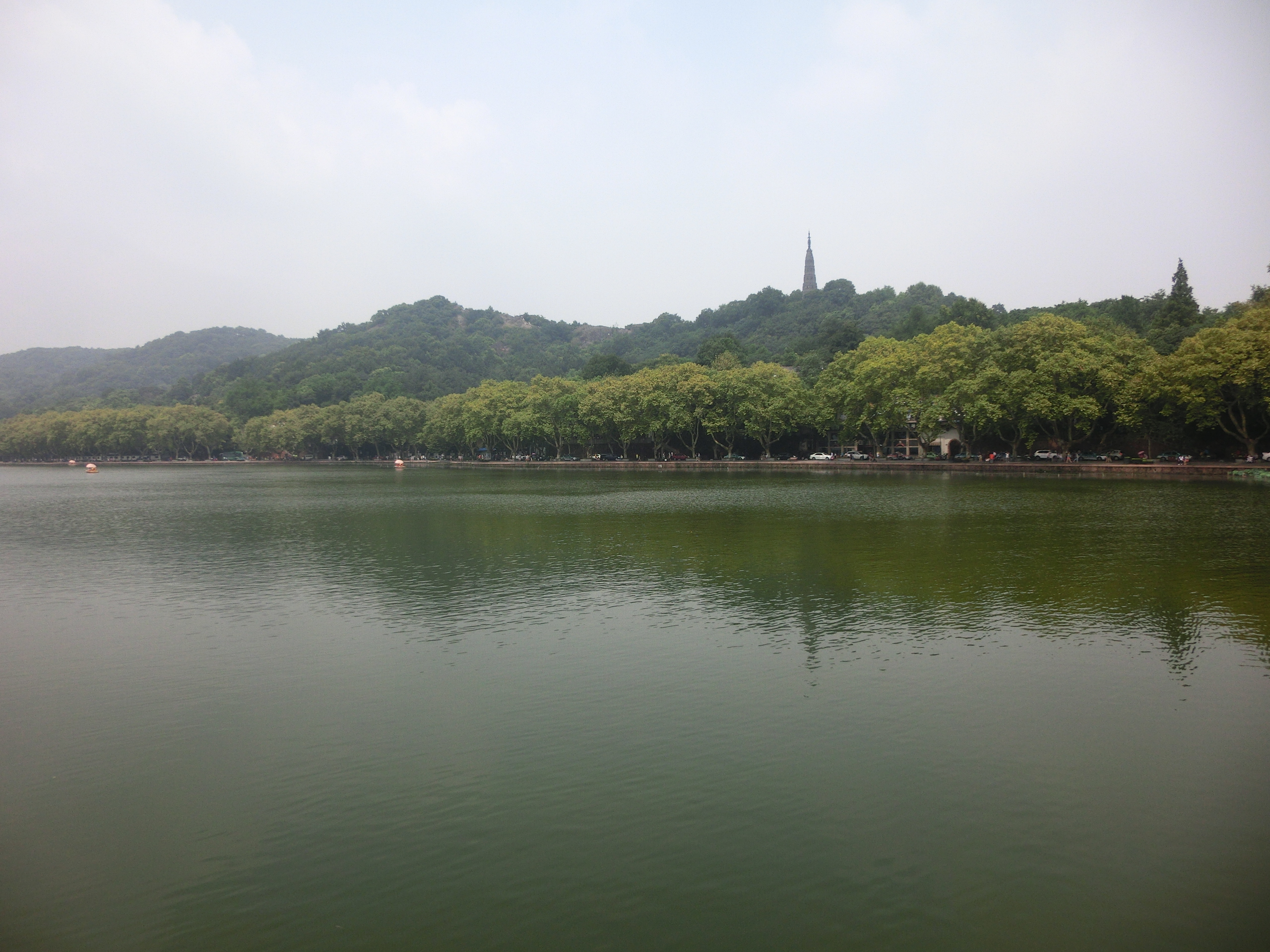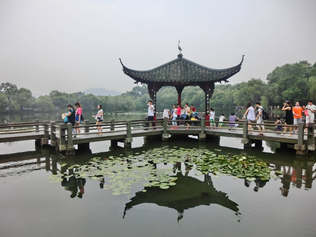 The region of West Lake near the temple has a large stone bridge built over it, which reaches halfway to the opposite shore. There were also many boats available for hire for visitors to tour the lake themselves or with a guide. The smoky shapes of mountains in the background, reservoir of lily pads near the shore, and calm waters all created a tranquil setting perfect for an afternoon walk.