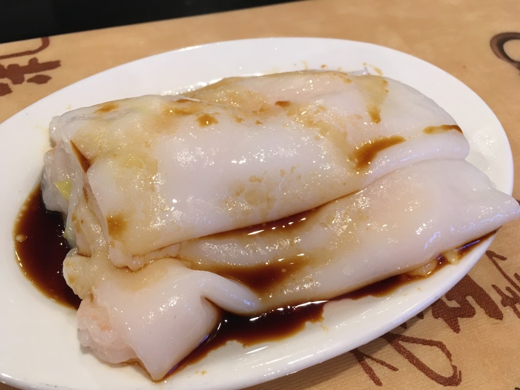 Finally, we had shrimp rice noodle rolls (蝦腸粉, xiā cháng fěn), which consists of shrimp wrapped in a soft noodle wrapper. The wrapper is very chewy, smooth, soft, and rather insipid in taste, which is why soy sauce is the most common condiment for this dish.