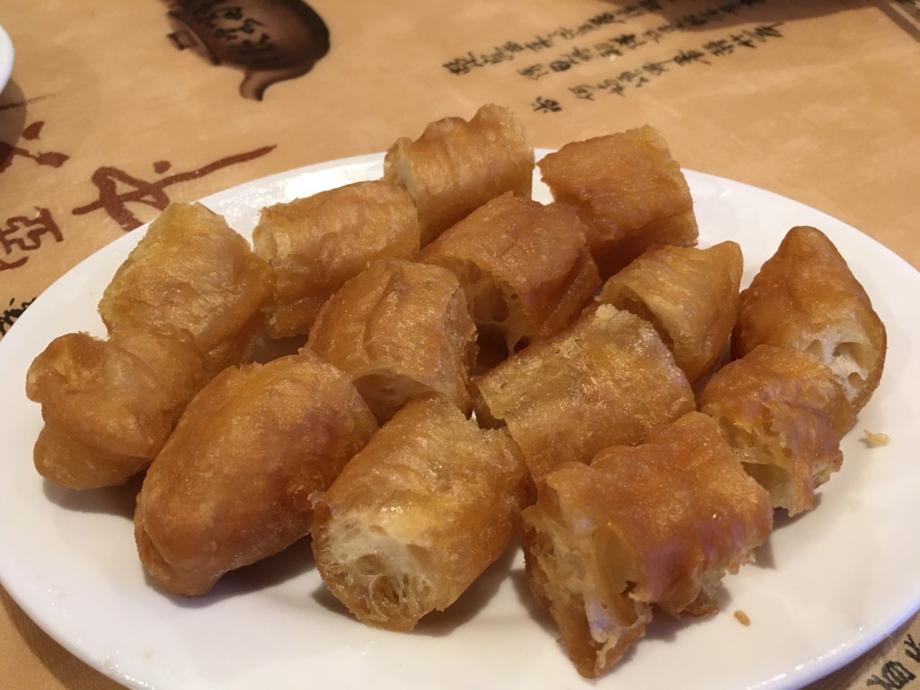 A staple side dish for congee are fried dough sticks (油條, yóutiáo), kind of like a Chinese version of Italian breadsticks. They are thick, chewy, fried sticks of dough filled with air pockets, and go very well with the liquid consistency of congee (like how crackers go well with soup).