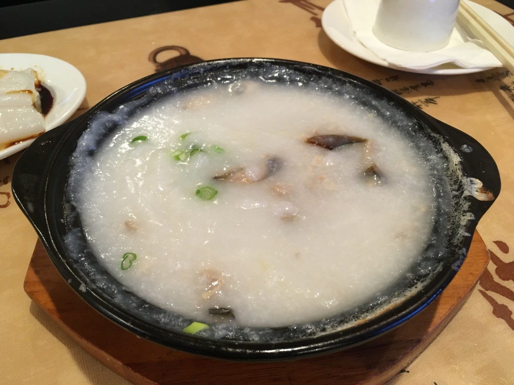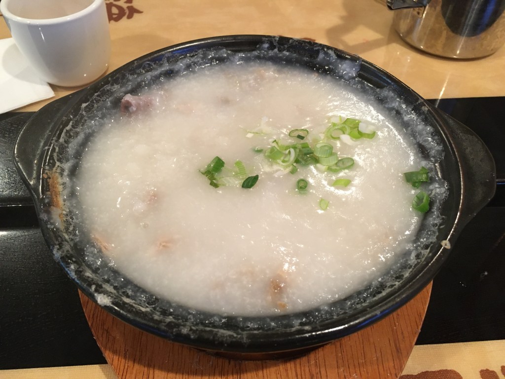 We ordered congee (粥, zhōu), which is a sort of Chinese rice porridge. However, congee can vary greatly from region to region. For instance, Taiwanese porridge tends to be less flavorful, and is prepared simply by cooking rice with a higher ratio of water, while Guangdong porridge is directly cooked with ingredients like herbs and meat to infuse the mixture with various flavors.