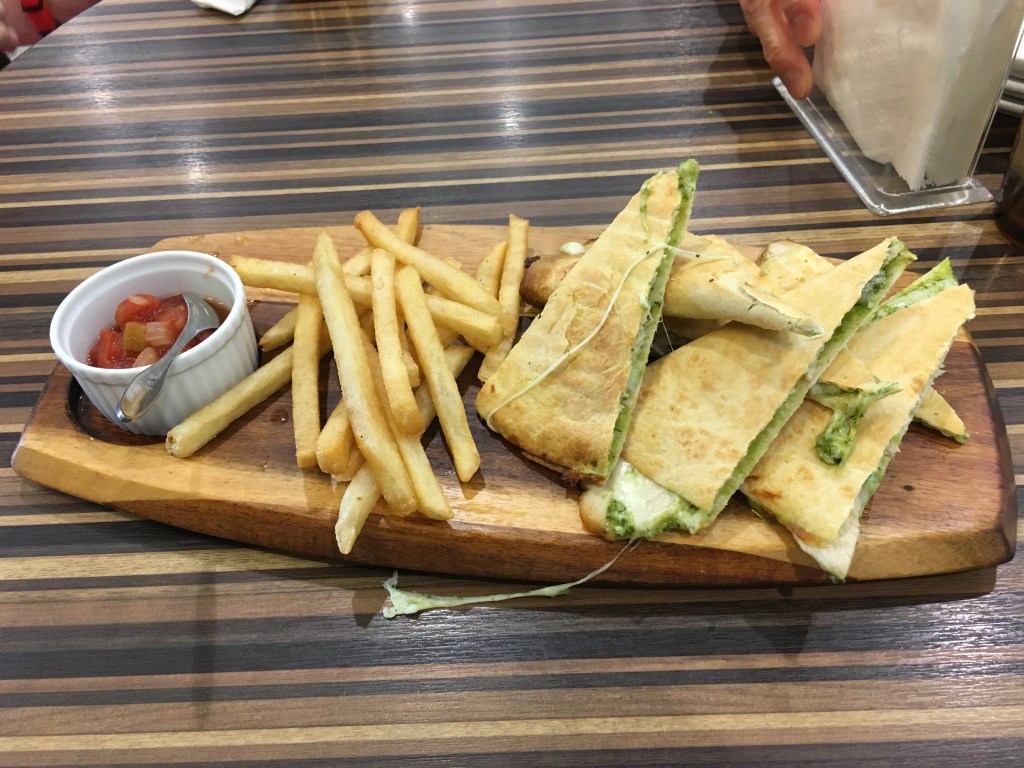 For an appetizer, we ordered vegetable tomato soup, which was fairly basic- there were vegetables like celery and onions in a clear tomato broth. We ordered several entrées: a southern skillet, which contained roasted peppers, potatoes, onions, zucchini, and a fried egg drizzled with barbeque sauce, chicken and pesto quesadillas, shrimp and arugula pizza, and a vegetable and seafood risotto.