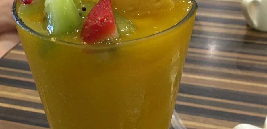 Our drinks included a chocolate milkshake and a mango slushie, and a slice of cake for dessert.