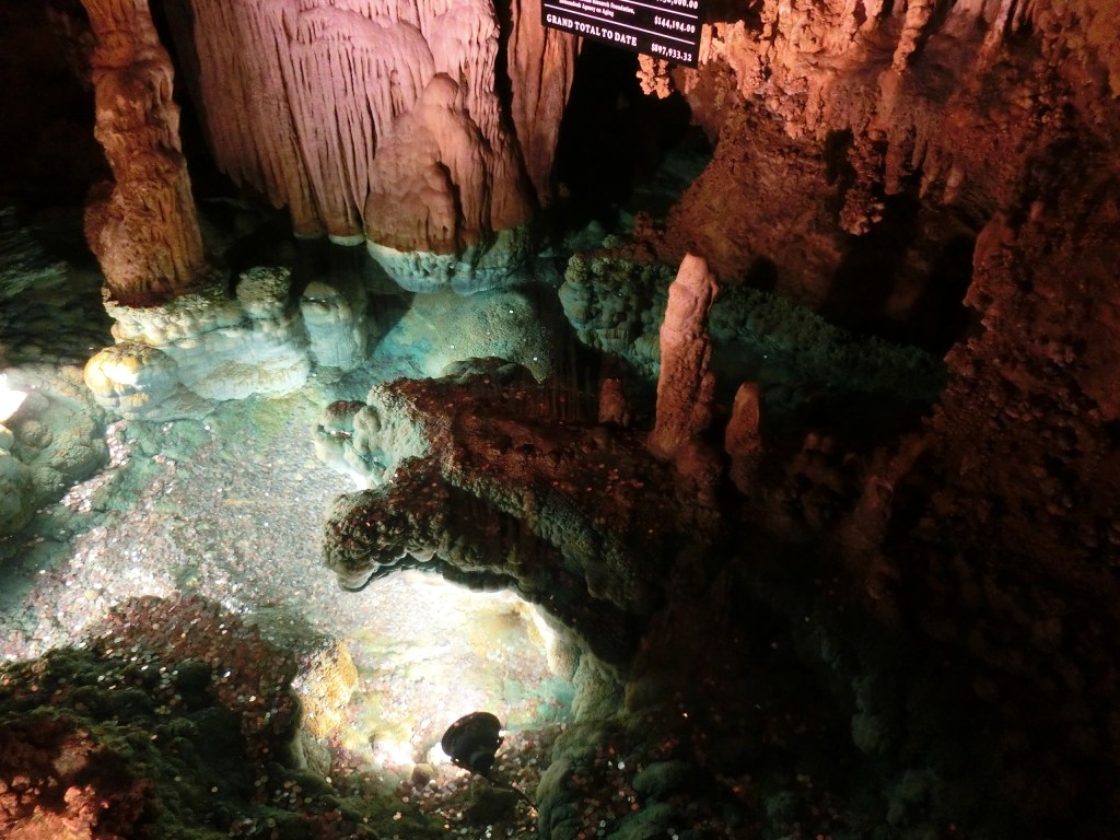 Rock formations aside, there were also beautiful pools of water within the stone floors of the caves. Some pools simply flowed around the stalagmites on the ground, but others glittered in bright ponds contained within the rocky ground. The water in such pools was lit in such a way to make them appear to be a bright, shimmery turquoise, which made them especially eye-catching by breaking the surrounding beige-brown of the stone all around it. Our tour guide led us around the cave as we passed structures that looked like stone waterfalls frozen in time and other rocky spines that littered the cave. If you’ve never been to an underground cavern, I highly recommend visiting one! It’s a very strange but fascinating sensation being in an environment so different from what most of us are used to.