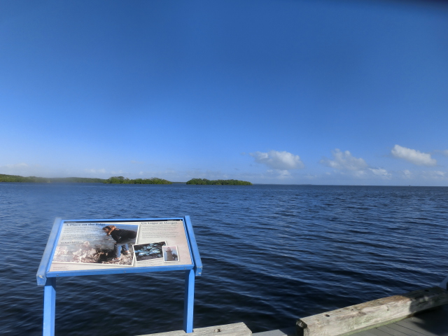 We drove over to Biscayne National Park’s Dante Fascell visitor center, which was a departure from the environment of Everglades National Park! While the latter featured swampy lakes and marshy, grassy fields and forests, Biscayne highlighted wide stretches of open blue water. It was another beautiful sunny day, and the sun in the blue sky shining on the water created an idyllic atmosphere.