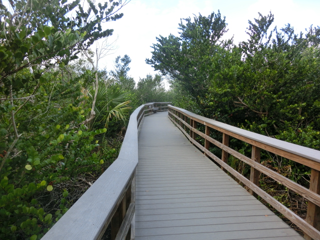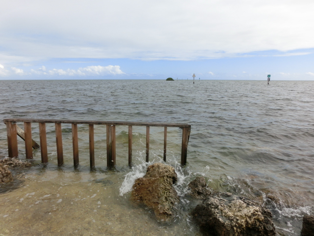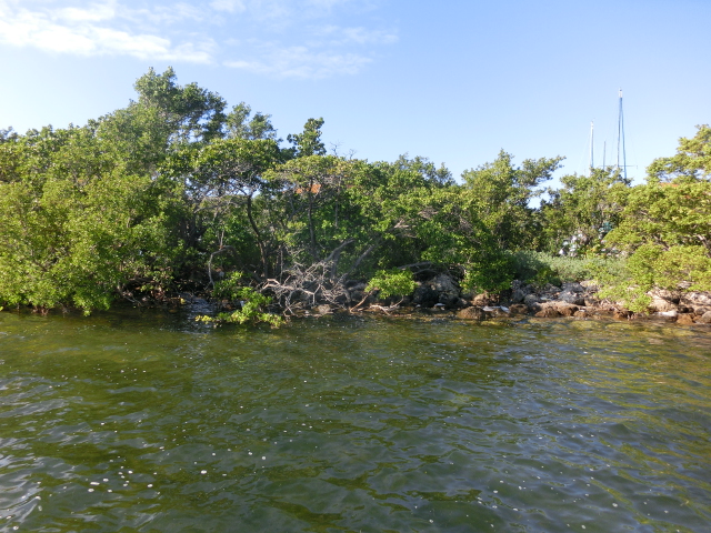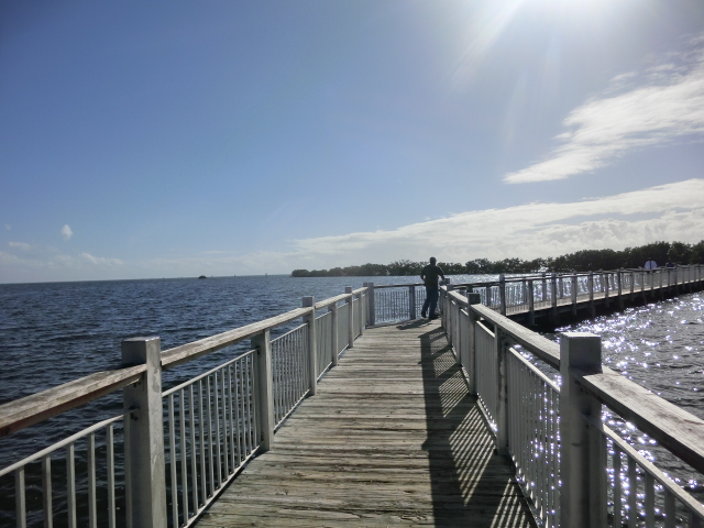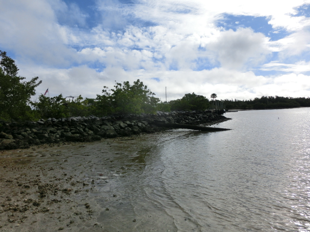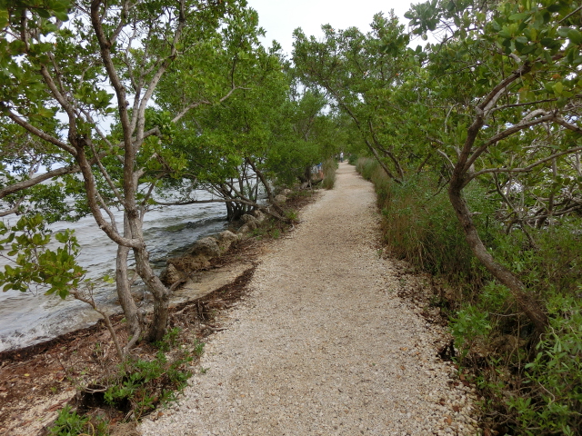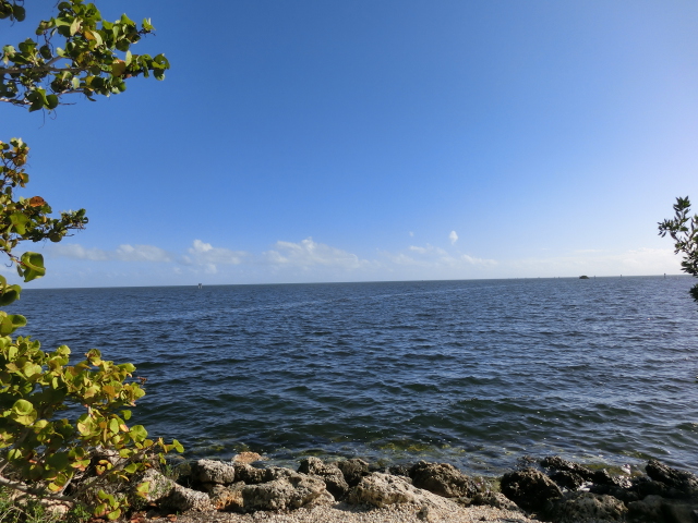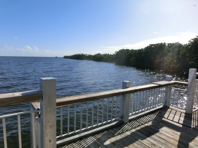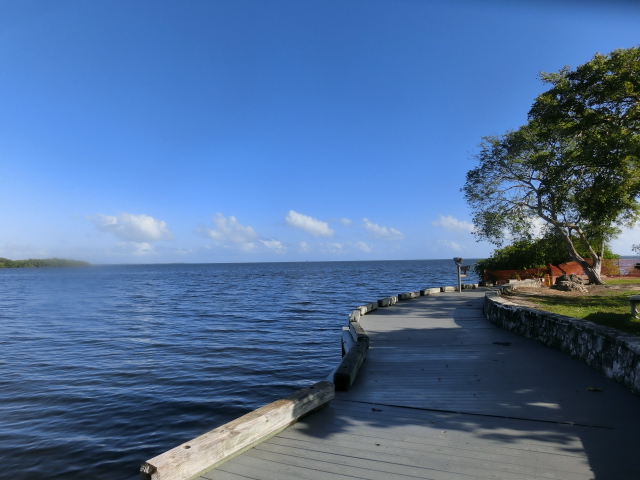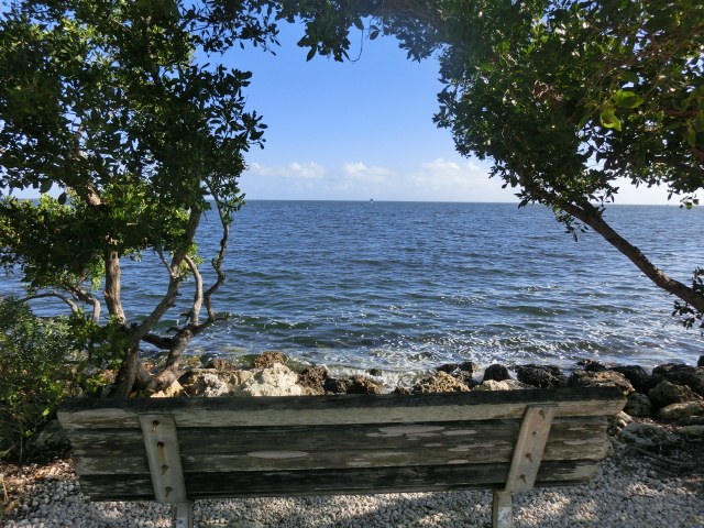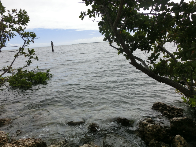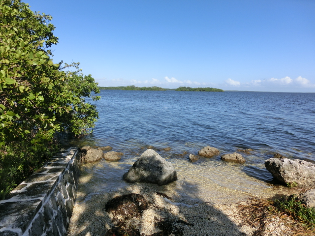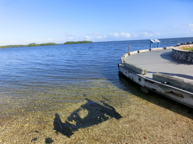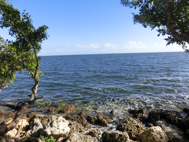 We strolled along the piece of land that stretched from the visitor center into a tiny peninsula in Biscayne Bay (and when I say tiny, I mean that the strip of land was barely two people wide!). The peninsula had trees growing along its edges, but several gaps in the greenery gave you a great view of the bay. These shady gaps were littered with large rocks, which made them wonderfully cool places to sit and escape from the brightness and heat of the sun. The very tip of this strip of land was submerged in water, and a small wooden railing blocked the end.