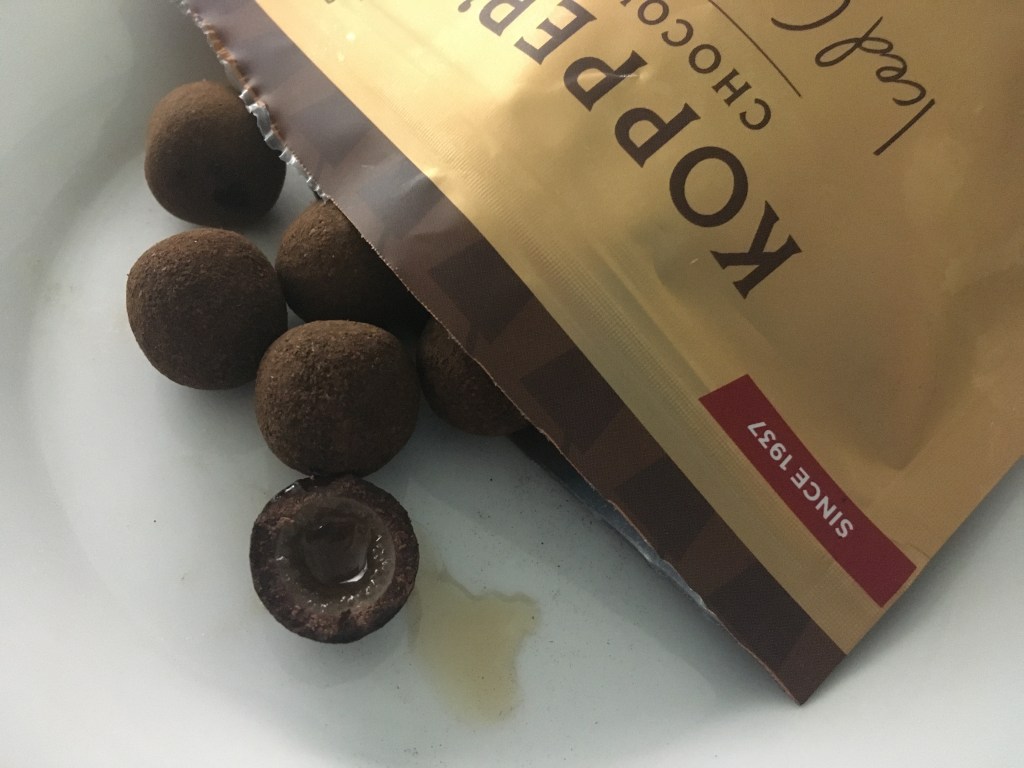 The next snack was the Iced Coffee Bites. Now, these were particularly interesting to me because I’ve never had cordials before, which describe desserts with a sweet liquid filling. Each bite was dusted in cocoa powder, and consisted of a crispy dark chocolate exterior with a golden-colored, coffee flavored liquid center. While the flavor or coffee was prominent, the center was slightly too sweet for my taste, and this is coming from someone who dislikes the bitterness of the drink, which goes to show how sugary it was. Overall, I would recommend this snack to people who drink their coffee with about thirty packets of sugar.