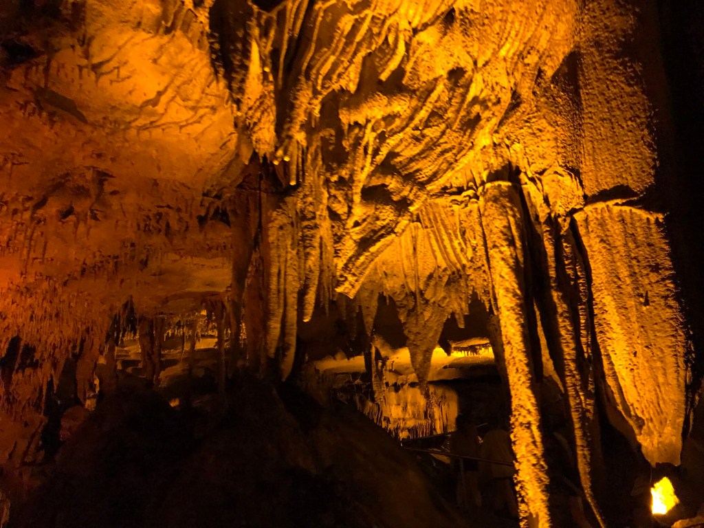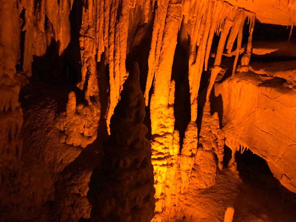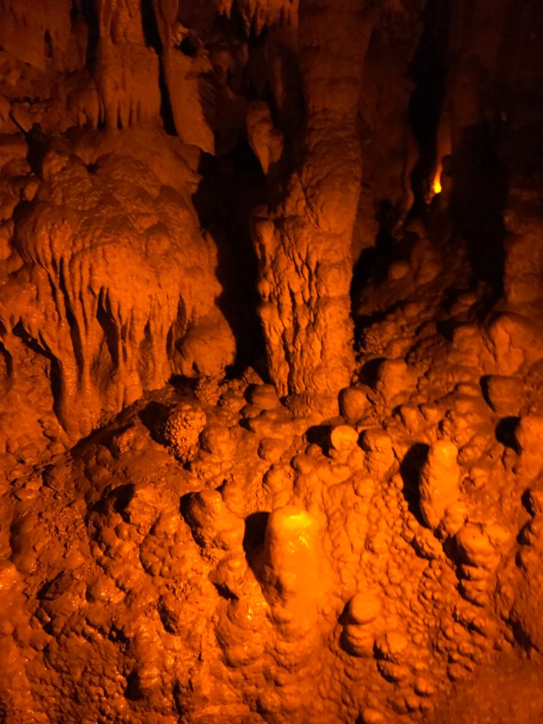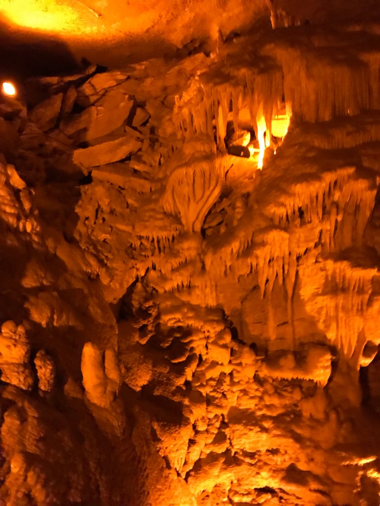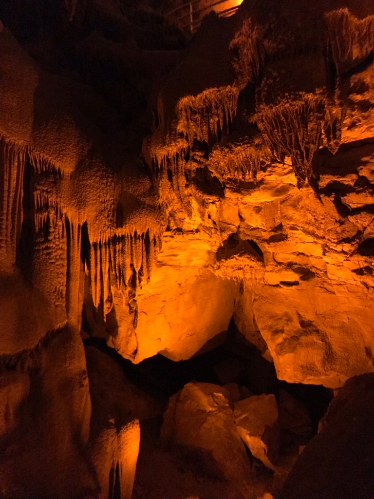 Our guide led us through the tunnels across stone rails, walkways, and stairs spanning gorges, steep formations, and winding passageways. Similarly to Luray Caverns, sharp rock formations protruded from the walls and floors, like falling water frozen in time.
