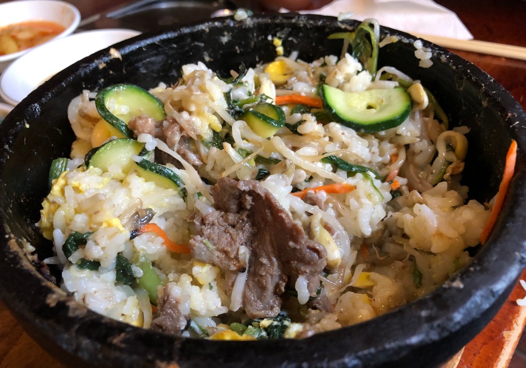 We ordered bibimbap, which is rice and fresh vegetables (and meat, unless you order it vegetarian) served in a blistering hot stone bowl. A raw egg is usually cracked on top, and everything is stirred together to cook the egg. The result is a mouthwatering blend of flavorful protein and carbs. One of my favorite parts of bibimbap is the crispy rice you get at the bottom of the bowl when you leave it there for too long without stirring- delicious!