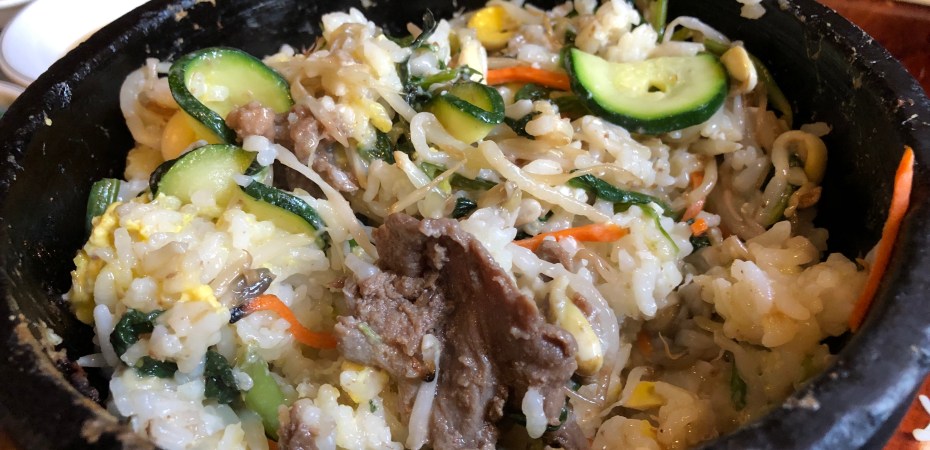 We ordered bibimbap, which is rice and fresh vegetables (and meat, unless you order it vegetarian) served in a blistering hot stone bowl. A raw egg is usually cracked on top, and everything is stirred together to cook the egg. The result is a mouthwatering blend of flavorful protein and carbs. One of my favorite parts of bibimbap is the crispy rice you get at the bottom of the bowl when you leave it there for too long without stirring- delicious!