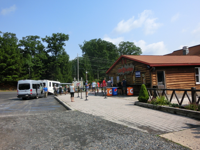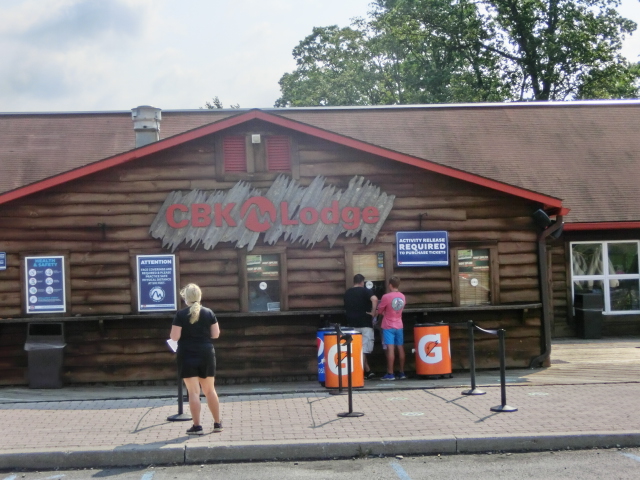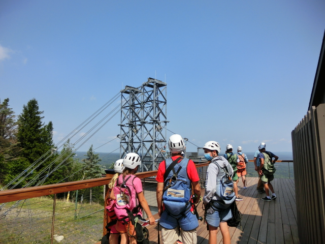 I was a bit surprised at how many people were there when we arrived, but I suppose I shouldn’t have been- we were urged to make reservations online ahead of time because their zipline was so popular. Proper COVID procedures were in place: everyone wore face coverings and sanitizer dispensers were available. Otherwise, it was almost like entering any busy vacation spot before the pandemic. Families of chattering people milled around or waited for their scheduled activities to begin. It was a beautiful sunny day; the sky was a vivid blue and fluffy clouds drifted lazily over the zipline towering in the distance.