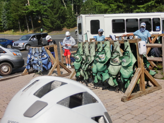 After receiving our tickets, we were led with our group to a cluster of color-coded harnesses. The staff directed us each onto a scale, where our weight determined the color harness we wore. We were then each given a heavy bag to carry, which contained a series of crisscrossing straps and carabiners, as well as a helmet.