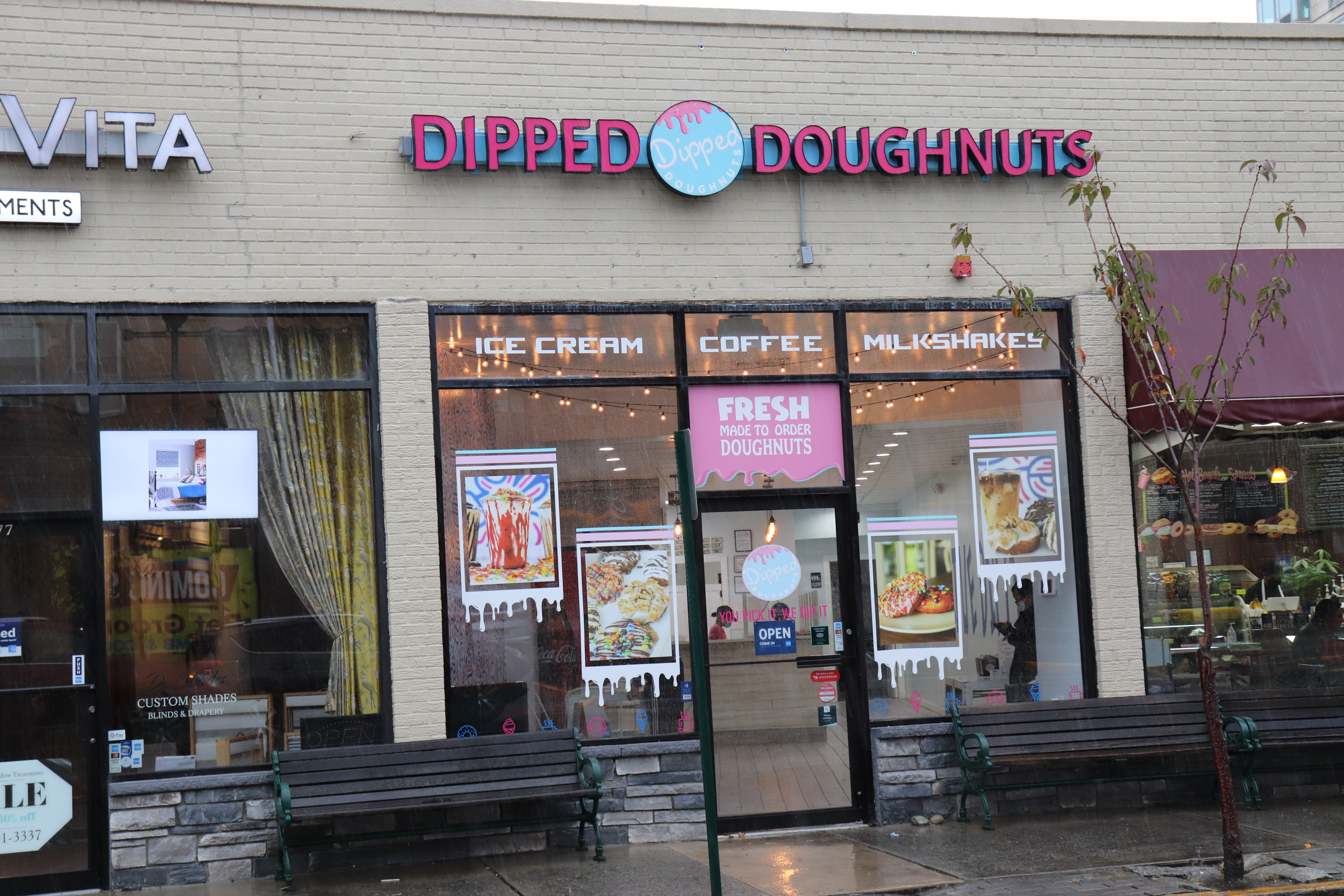 Our next stop was at a small local shop in New Jersey. The shop was rather empty, and there were very few customers within. The ordering process was different from Krispy Kreme, with a stack of order forms and pencils placed on a small table at the entrance. The form allowed you to customize your order, from the flavor of the coating, toppings, and drizzle. A metal deep-fryer sat on a counter in the back, and a glass shield showed a customizable bar containing metal pails of crushed cookies and other toppings. After we paid and handed in our form, a worker pulled donuts from the fryer and dipped and topped them according to our order. I was impressed by how skilled the worker preparing our box was; she drizzled and sprinkled and dipped efficiently, creating colorful donuts with even stripes right before our eyes. I had a much better experience with Dipped Donuts than at Krispy Kreme. The treats were still warm and fresh from just being fried, and the doughy bases were airy and light. While I liked how versatile the ordering process was and the fact that they were added on the spot, my one complaint is that the toppings are rather sparse. The glazes and garnishes were tasty and aesthetically pleasing, but I feel that it was a rather thin layer. However, overall the final product is satisfactory, with fresh, fluffy rings topped with flavorful coatings. Thus, although I think that these donuts were rather stingy with their toppings and probably still weren’t worth the $11.20 that the box of six cost, I would be more willing to pay for these than a box of Krispy Kreme donuts.