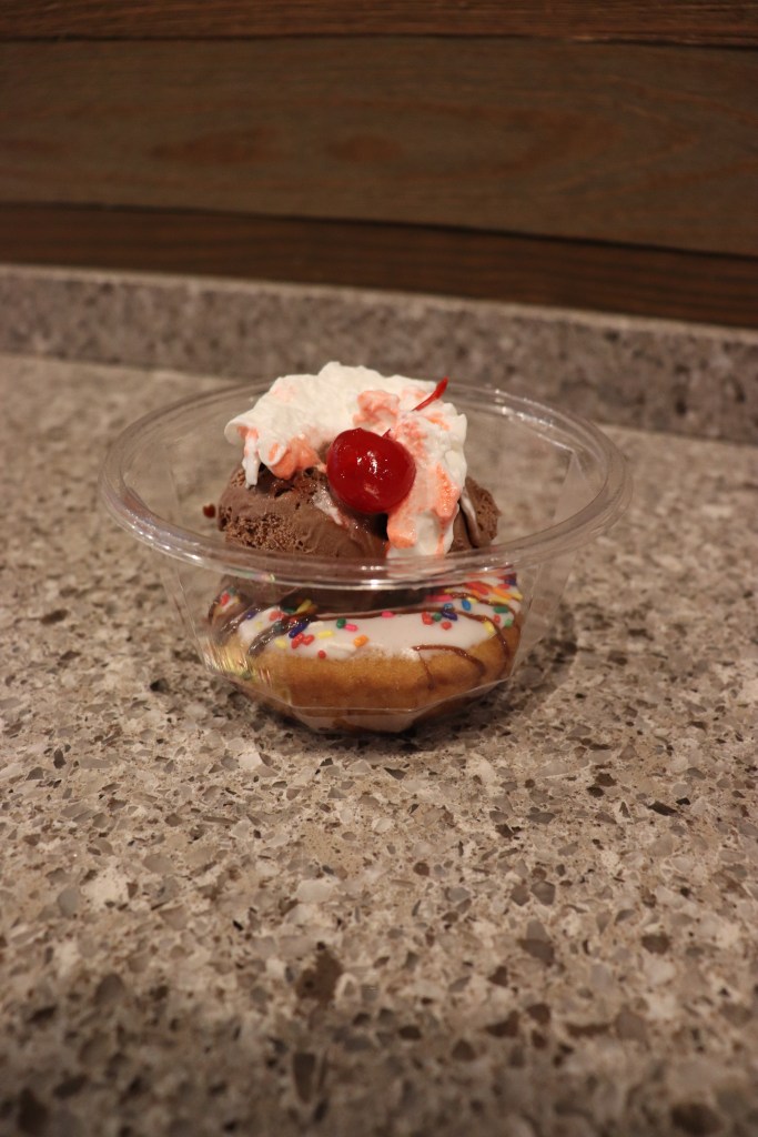 Next was a relatively new location in New Jersey- Duck Donuts. I had never been to this shop before, so I wasn’t quite sure what to expect. However, the length of the line we were waiting in implied that this shop had already made a positive impression on many patrons. We decided to stray from the six-donut box formula we had been following and purchase a donut sundae instead, which we customized with an order form similar to the one at Dipped Donuts. Our final order was a vanilla cake donut with a vanilla coating, hot fudge drizzle, rainbow sprinkles, with a scoop of chocolate ice cream and topped with whipped cream and a cherry. (It was definitely indulgent…) While I was a little dismayed with the price of $5.75 for one small sundae, I was stunned at the product we received. The dessert consisted of a scoop of ice cream on top of a frosted donut, and it was incredible. The donut was fresh and warm, and I loved how it was slightly crispy outside but soft and airy inside. Furthermore, the place where the layer of icing that coated the top of the pasty met the ice cream created a deliciously chewy combination of flavor and texture. The contrast between the toasty donut and the cold ice cream was such an interesting combination, and I could understand why so many customers were flocking to the store. While we had to wait a considerable amount of time, I have to say that taste-wise this was probably my favorite shop so far.