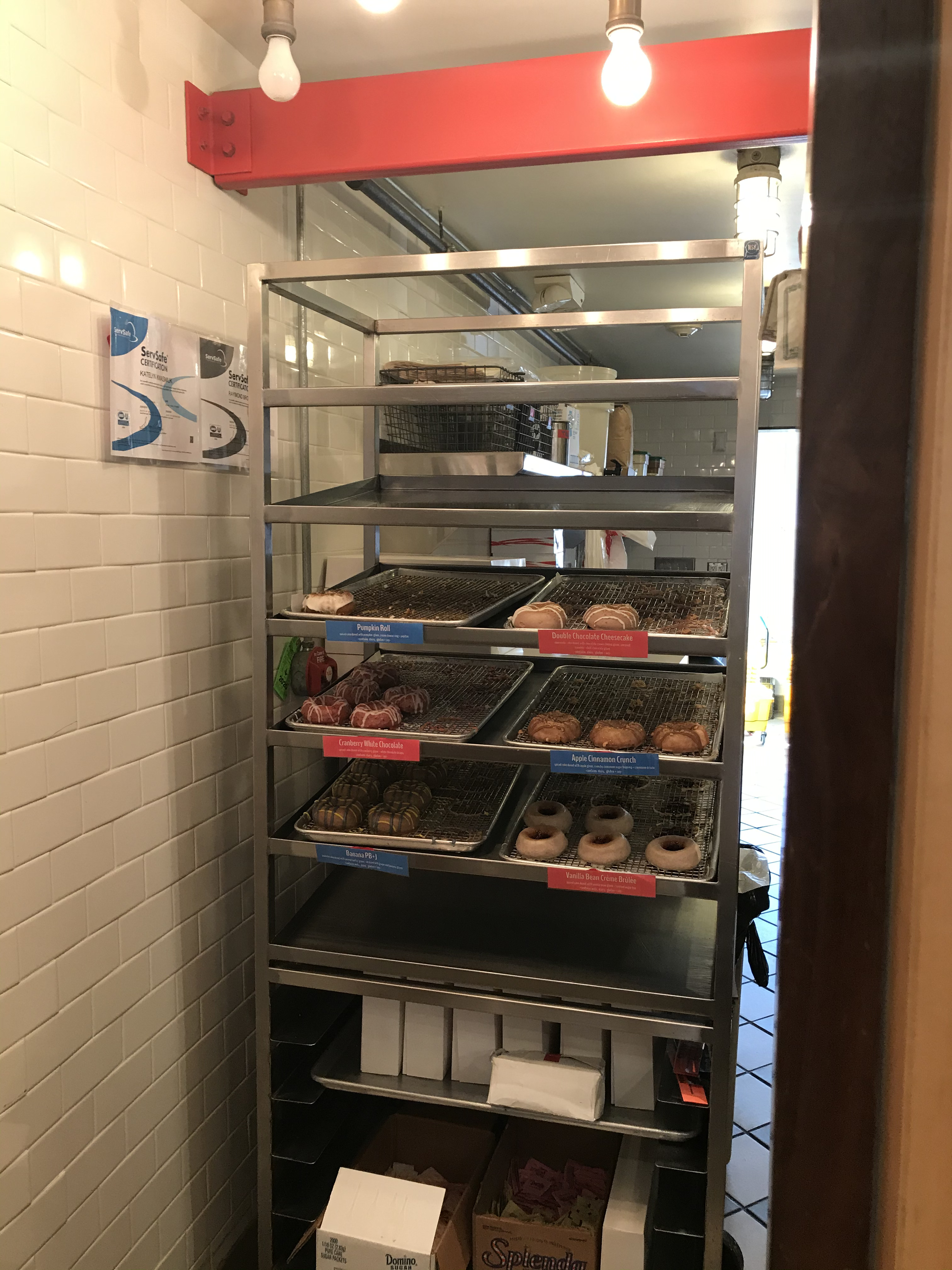 Our last stop was Federal Donuts, a shop in Philadelphia. It was the most expensive place so far, with a box of six donuts setting us back a total of $13.50. However, this shop produced donuts unlike the others we had purchased so far. They categorized their desserts into two categories: Fancy and Hot Fresh. The Fancy donuts involved a more elaborate combination of flavors and toppings, while the Hot Fresh donuts were made on the spot. We ordered all three types of Hot Fresh donuts- Cinnamon Sugar, Strawberry Lavender, and Cookies and Creme. The last three donuts were Fancy- Pumpkin Roll, Double Chocolate Cheesecake, and Apple Cinnamon Crunch. Out of the three shops that we ordered six donut boxes from, this was my favorite by miles. What set these apart from the others was that their bases were soft, fluffy, and dense, more cakelike rather than the fried dough that is the standard for donut bases. I also appreciated how they were very generous with the toppings- these donuts were positively loaded with coatings-which were flavorful and beautiful, but not overwhelming. I was most curious about the Strawberry Lavender donut, which turned out to be one of my favorites. It consisted of a soft donut covered in a layer of strawberry-flavored sugar granules with a floral hint of fragrant lavender. My other favorite was the Double Chocolate Cheesecake donut. Unlike the other donuts, which were exclusively sweet, the flavor of cheese cut through the denseness of the rich chocolate donut and was complemented by the crunch of graham cracker crumbs.