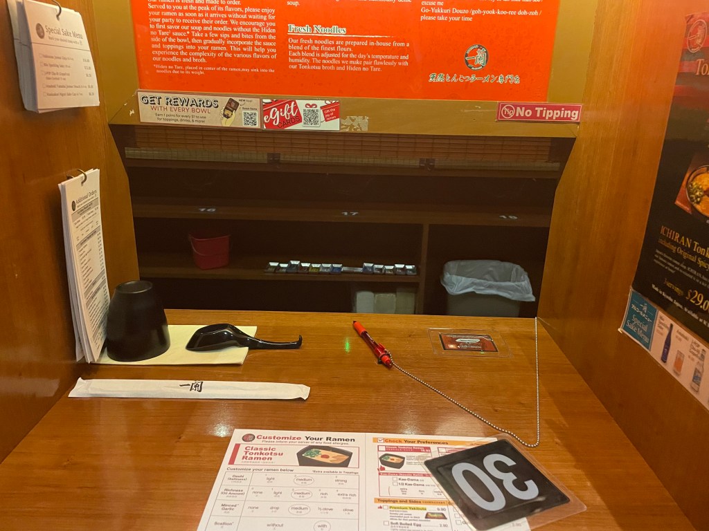 There are colorful signs and introductions placed on the inside of your cubicle that introduce various Japanese phrases and teach you a little about the background and practice of enjoying ramen, which you can read while you wait.